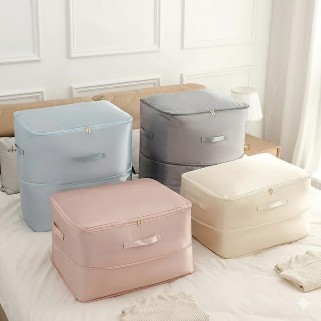 Dankzij de dubbel-laagse compressietechnologie neemt alles aanzienlijk minder ruimte in beslag — perfect om je kledingkast te optimaliseren of seizoensspullen compact op te bergen.
